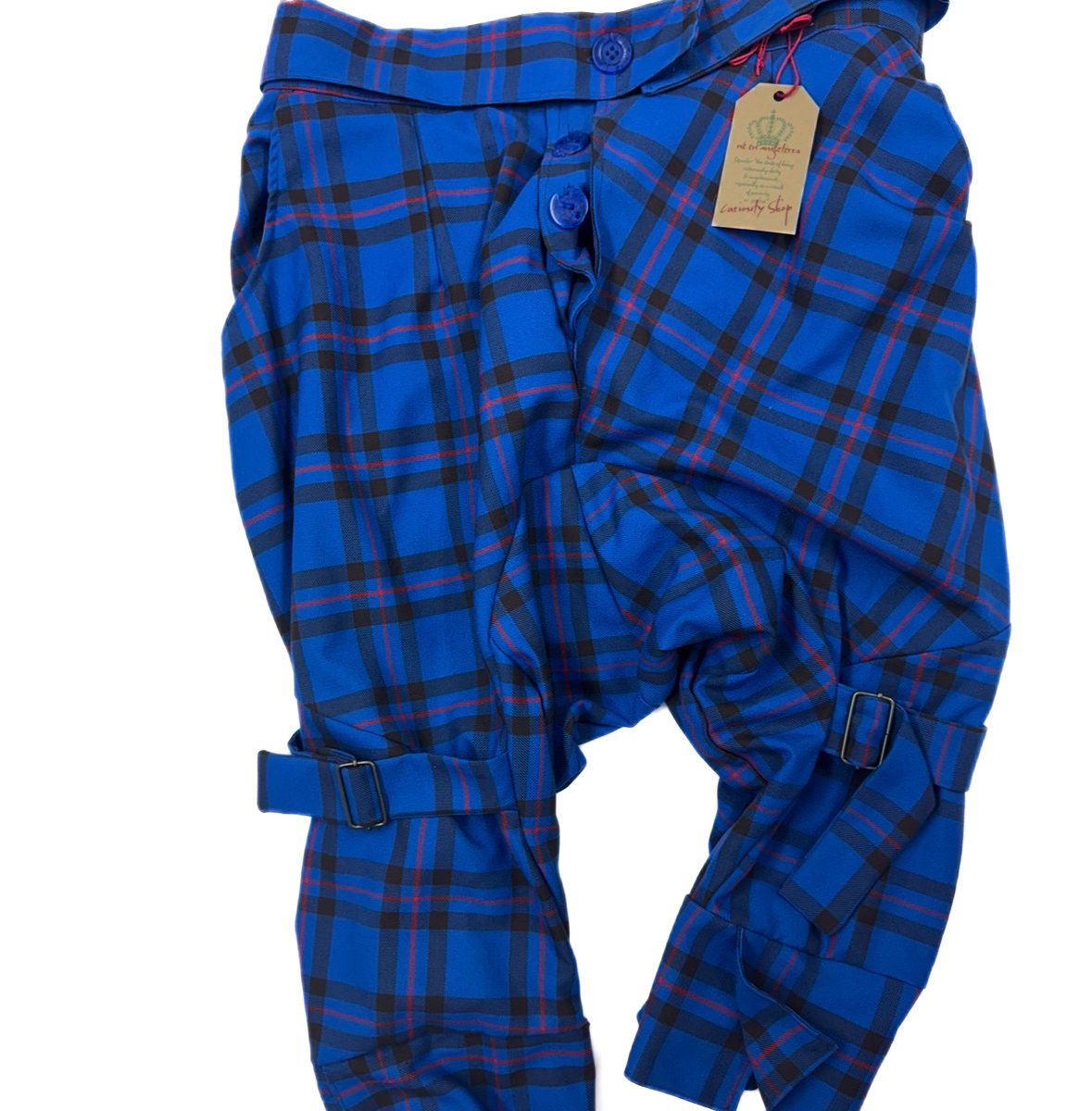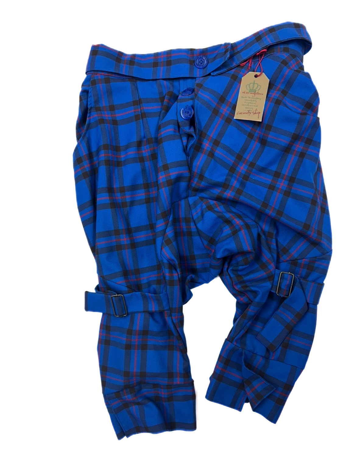 Two integrated bondage straps, cut from the same cloth, secured with black wire buckles just below the knee. Wear them loose or fastened up, depending on the mood or how baggy you want them